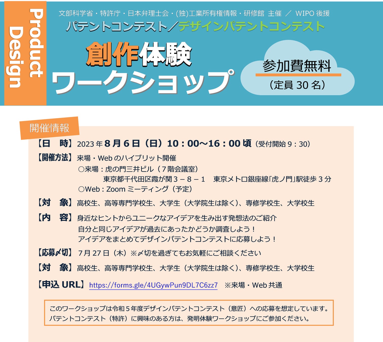 このワークショップ企画では、作品のパテントコンテスト/デザインパテントコンテストへの応募を通して、特許権(発明)や、意匠権(デザイン)の獲得を目指します。この夏の一日体験で実際に権利を手にする生徒や学生が毎年出ています。