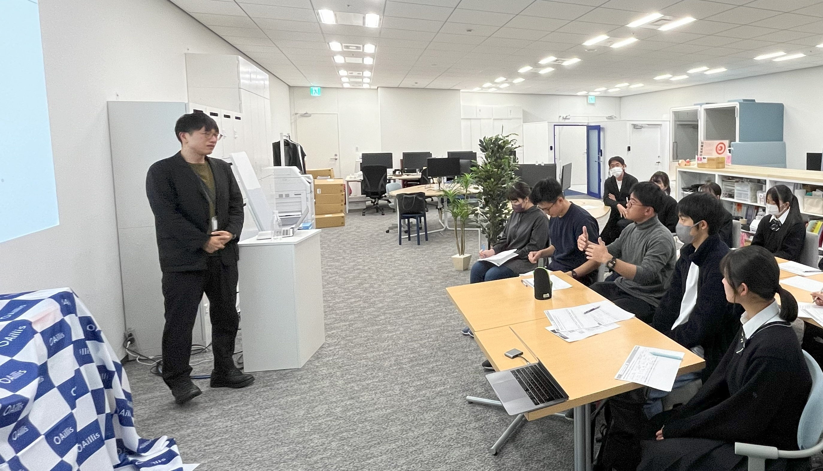 今回のプログラムはその一環として実施され、弊社執行役員の田中が講師として栄東中学・高等学校の12名に、テクノロジーの進化に伴う急速な社会変化に対応するためのキャリア観に関する授業を行いました。
