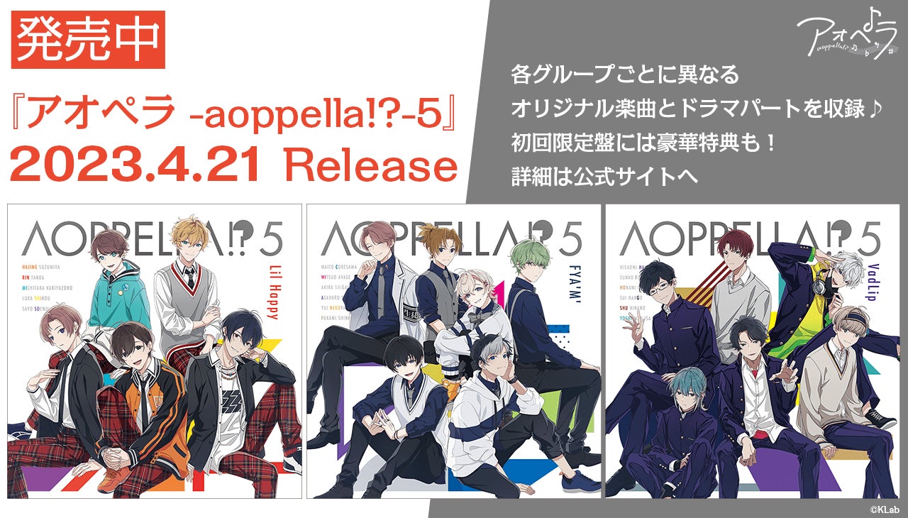 4月21日(金)にプロジェクト5枚目のCD「アオペラ -aoppella!?-5」が、発売されました。今回発売される「アオペラ -aoppella!?-5」は、リルハピ、FYA'M'、新グループVadLipのグループ毎に仕様が異なり、それぞれのデザインジャケット、オリジナル楽曲とドラマパートが収録されています。