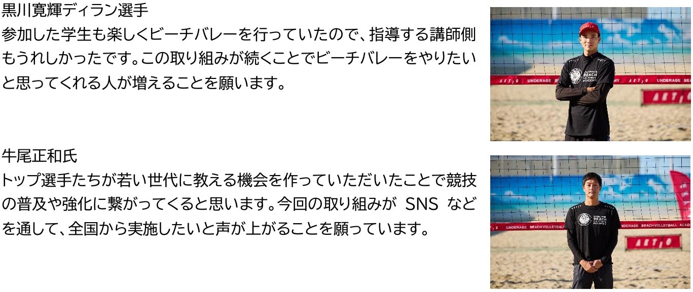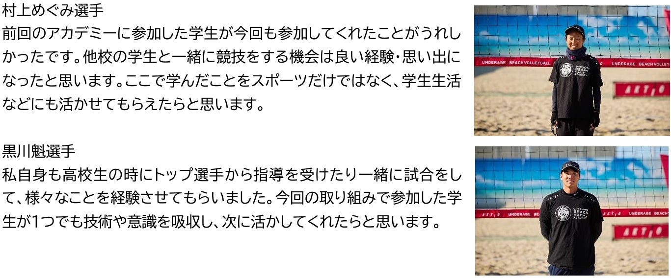 今回開催した「AKTIO アンダーエイジ・ビーチバレーボール・アカデミー」vol.5では、現役のプロビーチバレーボール選手が、部活動でビーチバレーボールやインドアのバレーボールに取り組む中学生・高校生を対象に、試合での戦略や戦術、コンビネーション、勝利への考え方などについて実践形式で指導をしたり、ゲーム練習を行いました。