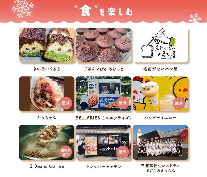 2023年12月24日(日)にイオンスーパーセンター三笠店にて開催される本イベントには、三笠ならではの「食」「クラフト販売・展示」「ワークショップ・体験」「ステージ」が盛りだくさんです。2018年にオープンして以来、地域活性化のシンボルとして人気を集めている話題の三笠高校生レストラン「まごころきっちん」も出張店で登場! 調理師を目指す三笠高校の生徒達による、地元の食材を活かした本格的なメニューをイベント会場でお楽しみいただけます。三笠の魅力があふれるイベントとなっておりますので、地元の方はもちろん、三笠市近郊の方もぜひ今年のクリスマスイブは三笠市にお立ち寄りください。