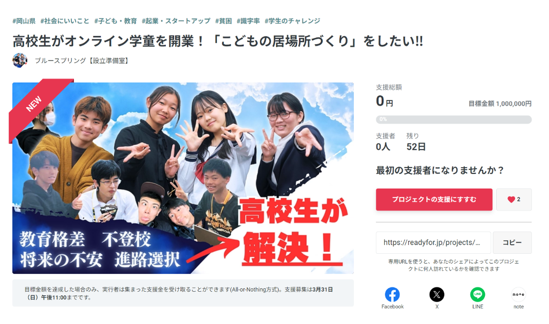 ワオ高校の起業コースメンバーは、オンライン学童「こどもの居場所づくり」の事業化を目指し、2024年4月に「株式会社ブルースプリング」設立の準備を進めており、応援者を募るためのクラウドファンディングを2月8日から開始しました。