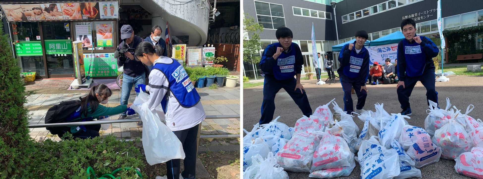 開閉会式会場となった長野市権堂イーストプラザ市民交流広場は長野駅からほど近い中心市街地にあります。何気なく通りを歩いているとごみは見当たらずキレイな街並みです。しかし、すぐ近くには繁華街の権堂エリアがあります。飲食店が多く並ぶこのエリアは前日が金曜日ということもあってか、路地にタバコの吸殻が多く散乱している様子がありました。「大人は責任をもってごみを捨ててほしい。」「ポイ捨ては恥ずかしい行為だと感じてほしい。」と参加者。海洋ごみの7~8割は内陸部から流出していると言われており、長野県においても海洋ごみ問題は他人事ではありません。スポGOMI甲子園は競技で最終的な勝ち負けは存在しますが街をキレイにそして海をキレイにという気持ちは同じです。同年代と清掃活動という行為を通して交流しあった高校生たち。上流県長野から海洋ごみ削減に貢献した1日となりました。