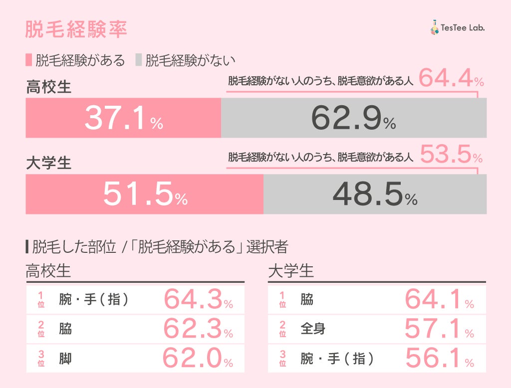 最初に、脱毛経験があるかどうかを調査したところ、「脱毛経験がある」と回答した人は高校生で37.1%、大学生で51.5%となりました。