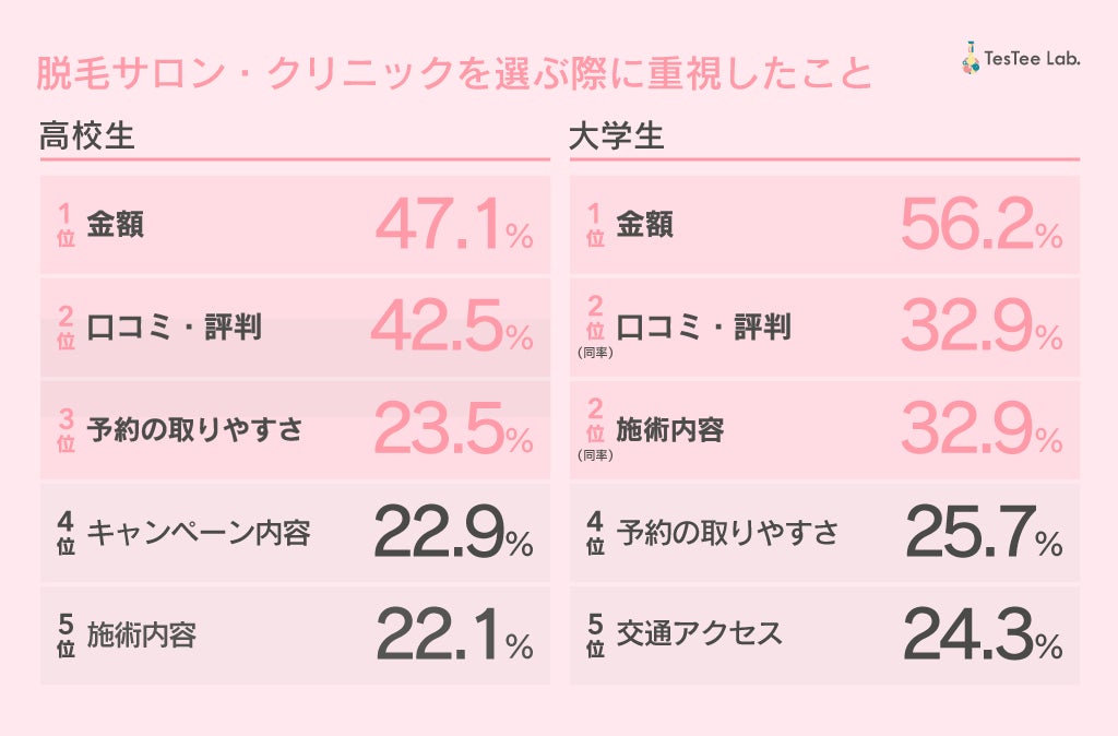次に、脱毛経験者を対象にサロン・クリニックを選ぶ際に重視していることを調査したところ、高校生・大学生ともに第1位は「金額」となり、次に「口コミ・評判」と続きました。重視していることにあまり差はないようです。