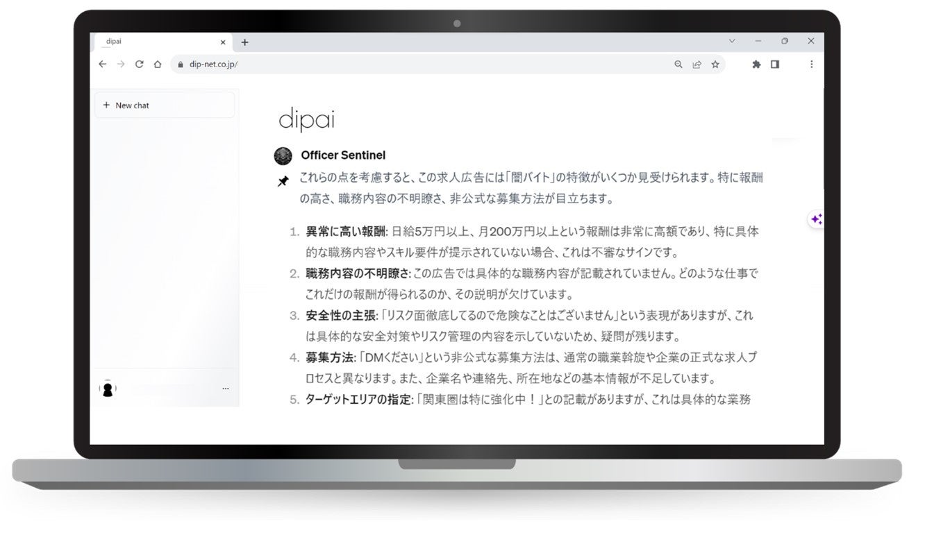ディップ株式会社は、生成AI技術を活用した新たな取り組み「闇バイトチェックAI」(以下、「本施策」)を開始いたしました。同時に闇バイト相談窓口を設置し、ユーザーからの申告情報の確認を進め、さらなる高い精度での闇バイト検知を実施します。