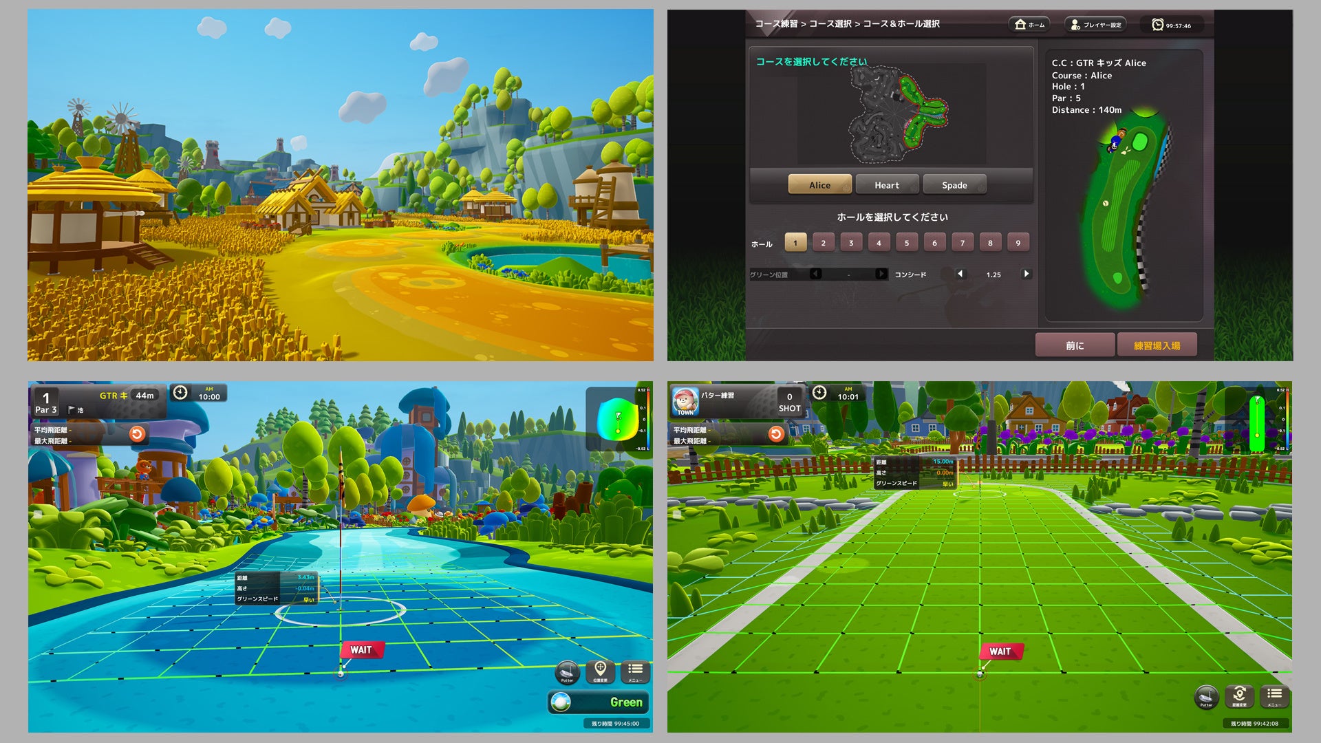 GTR KIDSは「練習モード」「コース練習モード」「ラウンド」の3モード。最新3Dグラフィックスによる壮⼤な冒険空間が広がります。そして、超⾼速カメラセンサーが、⾶距離やヘッドスピードを正確に測定し瞬時にスクリーンに再⽣。