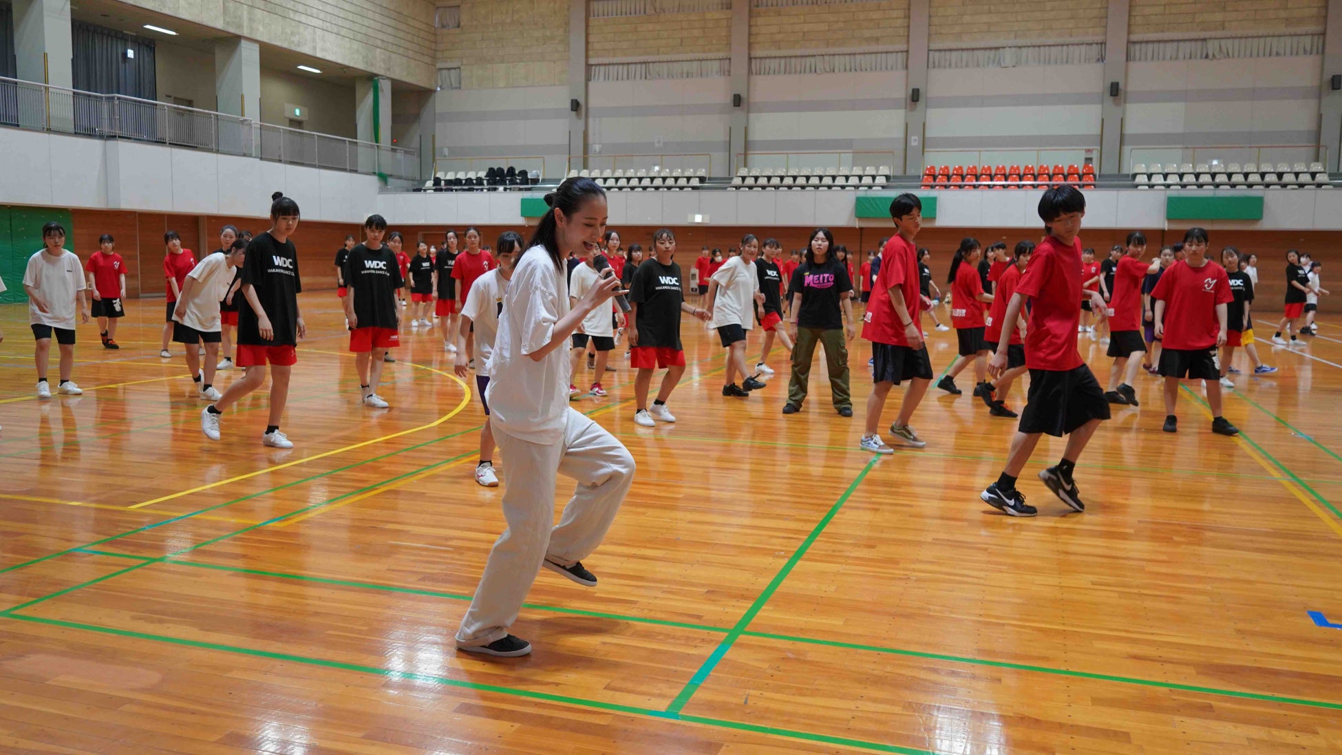 また途中、Miyuは振り付けのデモンストレーションを行い、生徒たちからは、世界レベルのダンスを間近で体験した驚きと喜びの大歓声が。最後にMiyuと参加者全員で習った振り付けのビデオ撮影会も行い、大盛況の中でワークショップは終了。参加したダンス部員からは、「テンポが早くて難しかったけれど、とても楽しかった」「Miyuさんのダンスを生で見られて感動しました」との声が聞かれました。