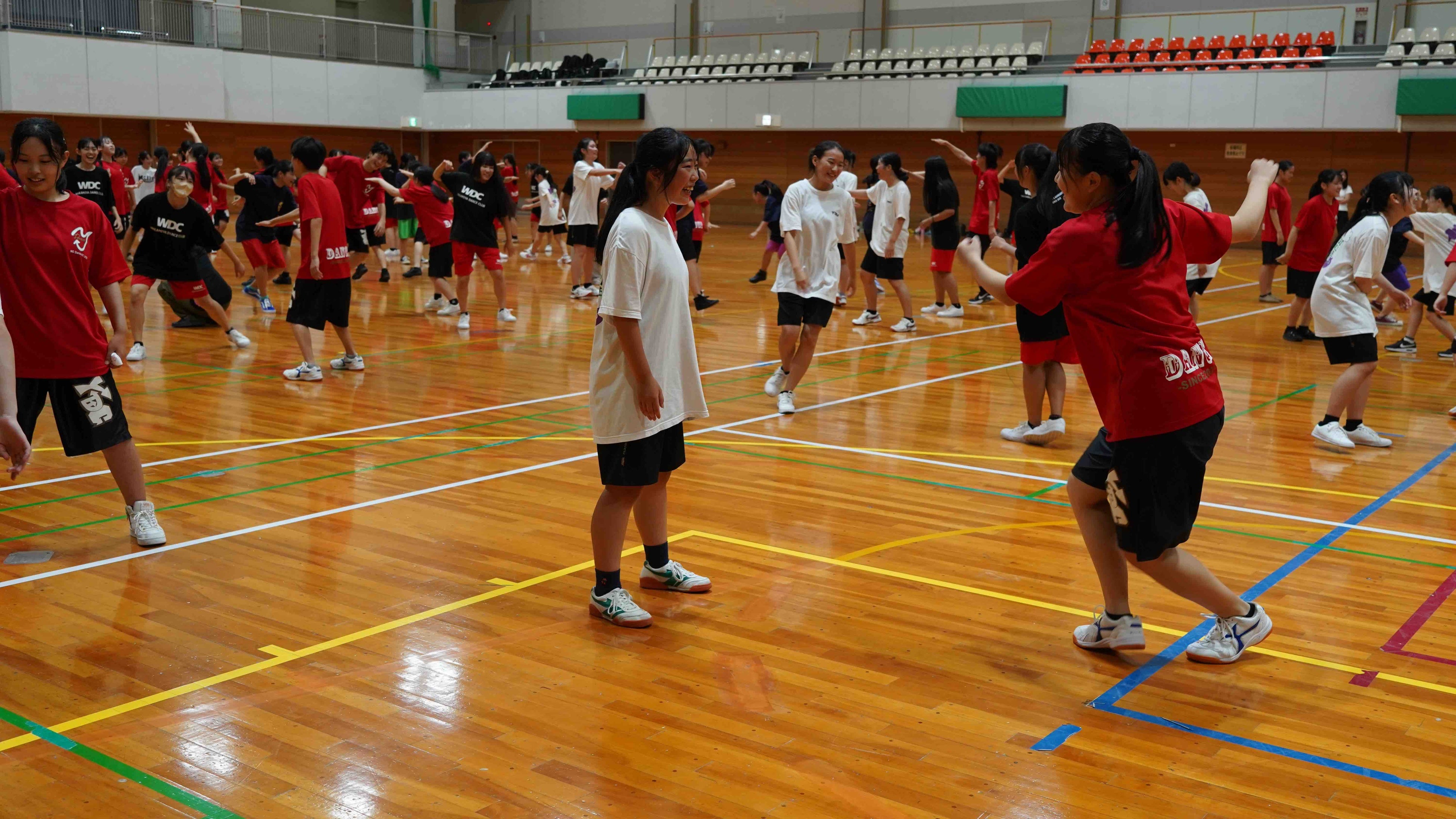 Miyuが得意とする「ハウスダンス」は、早いテンポの音楽に合わせて足で音を奏でるようにステップを繰り広げる、ストリートダンスの中でも難易度の高いジャンルで、専門的に練習をしているダンス部は全国でも数少ない。今回のワークショップでも、初めてハウスダンスに取り組んだダンス部員が多数だったが、参加5校が入り混じり、ペアで覚えたステップを見せ合ったり、グループごとに一緒にカウントを取りながら練習したりと、学校や学年を越えたダンスによる交流によって、笑顔の絶えない練習会となりました。