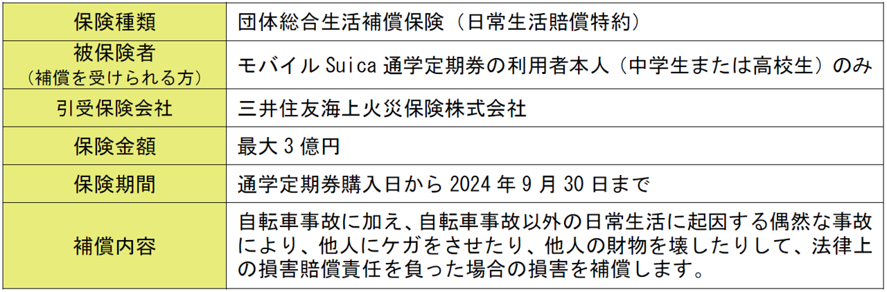 〇JR東日本は、中学生・高校生用のモバイルSuica通学定期券をご購入のお客さま全員に、特典として自転車保険(日常生活賠償補償/最大3億円)を購入日より最長6カ月間もれなくプレゼントするキャンペーン(以下「本キャンペーン」)を実施します。 〇近年、自転車事故による賠償責任は高額になるケースが多く、自転車事故による賠償責任を補償する保険への加入を義務化する自治体が増えています(注1)。本キャンペーンを契機に自転車保険への加入義務化の周知ならびに加入促進に努めます。 〇特典の自転車保険は、モバイルSuica通学定期券の購入決済と同時に付与され、本キャンペーンのエントリー・保険の入会手続きは不要です。また自転車事故だけでなく日常生活中の事故やトラブルも補償され、自転車を利用されない方も安心です。 〇春の新学期に合わせ、この機会にぜひモバイルSuica通学定期券をご利用ください。 |