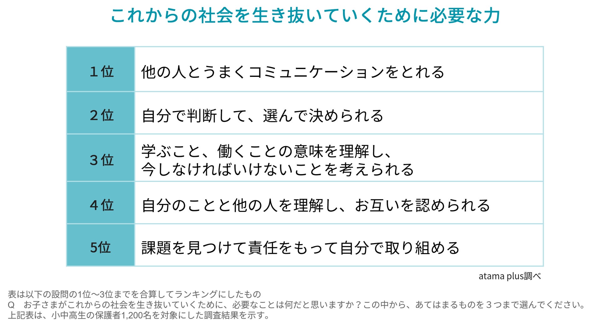 AI教材「atama+(アタマプラス) 」を小中高生に提供するatama plus株式会社(東京都港区、代表取締役CEO 稲田 大輔)は、小学生から高校生の子どもをもつ保護者1,200名を対象に、子どもに身につけてほしい力や理想の大人像について調査しました。その結果、保護者が子どもに求めるのは「コミュニケーション力」「レジリエンス」「セルフスターター」といった、大人の社会にも共通する力であることがわかりました。
