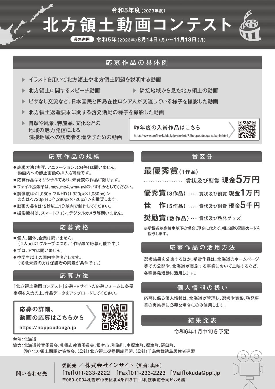 募集する動画は、北方領土に関するものや北方領土隣接地域の魅力を発信するもの(いずれも15秒以上1分以内)で、最優秀賞の方(1名)には賞状及び副賞5万円を贈呈します。