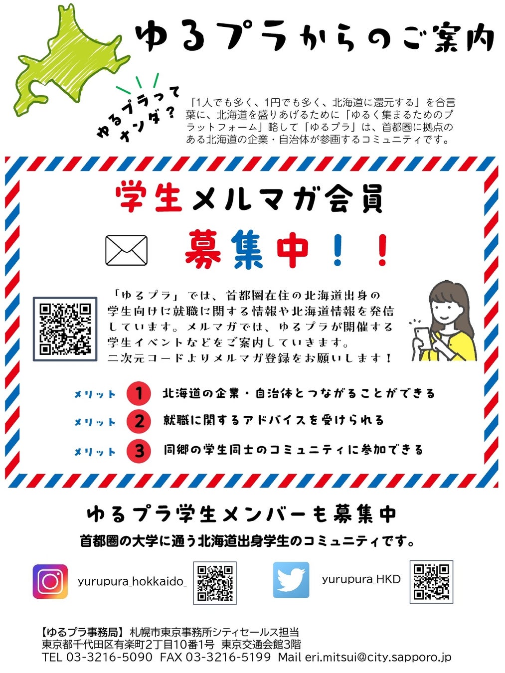 ※「ゆるプラ」では、北海道に関心のある学生向けに就職に関する情報や北海道の情報をメルマガで配信しています。特に北海道出身の学生は、ぜひメルマガ登録をお願いします。