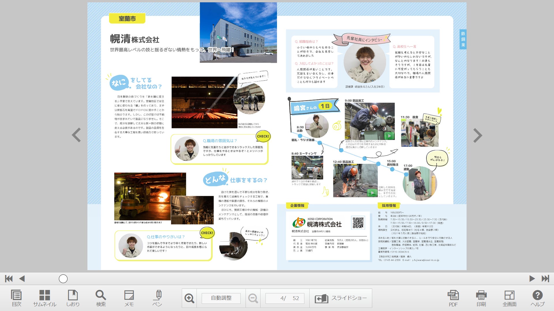 また、デジタルならではの大きな機能として、働いている様子を動画で見ることができます。高校生へのアンケートで「就職する企業を判断する項目」として給料や休日に次いで多かった回答が、仕事の内容と会社の雰囲気でした。写真や文章だけでは伝わりきらない作業の環境や様子などを動画でリアルに感じることができます。