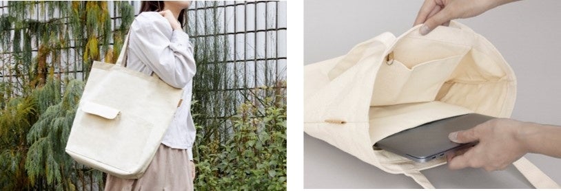 クッションポケット付きで、ケースに入れなくてもパソコンやタブレットを安心して持ち運ぶことができるトートバッグです。女子大生・女子高生の荷物量に合わせた丁度良いサイズ感を意識しています。また、PCポケット以外にも、荷物を整理して入れられるポケットが外側に2つと内側に1つ、さらにペットボトルホルダーが付いており、バッグの中での持ち物の迷子を防ぎます。カラーは幅広いスタイルに馴染むようシンプルなクリームとブラックの2色を用意しました。