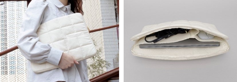 13 インチノートパソコンと電源アダプター等のアクセサリーを整理して収容できます。外側に凸凹のないスッキリとしたデザインで、カバンからスムーズに出し入れができます。生地には、大学生・高校生と一緒に選定したトレンド感のあるキルティングデザインを採用。外側にはスマートフォンを出し入れしやすいポケットがついています。カラーはクリームとベージュの2色を用意しました。