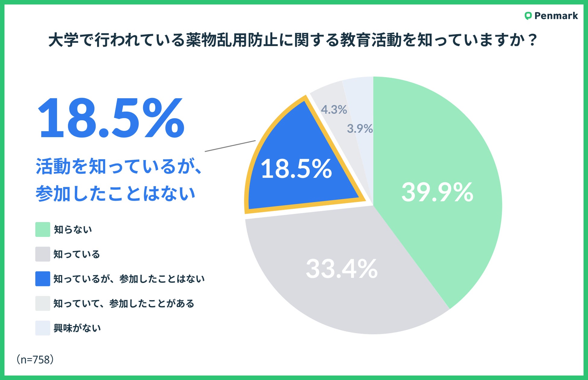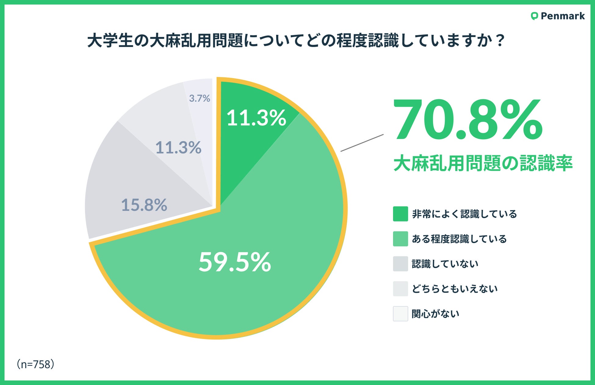 このような背景を踏まえ、株式会社ペンマークは大学生を対象にした大麻使用に関する意識調査を実施いたしました。本調査の目的は、大学生の間での大麻に関する誤解を明らかにし、適切な情報提供や啓発活動の方向性を示唆することです。