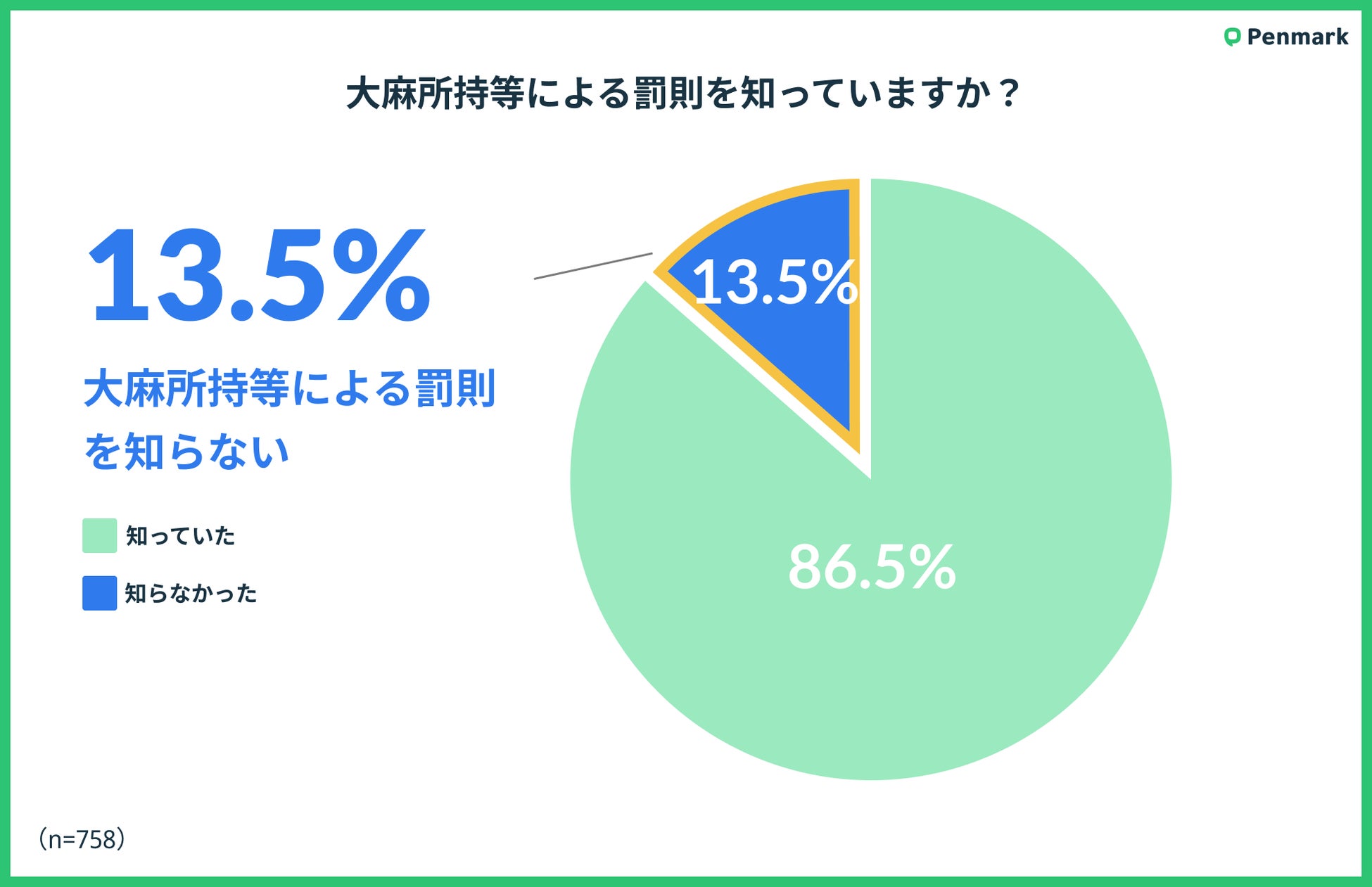 大麻所持等による罰則については、「知っていた」と回答した学生は全体の86.5%に上り、「知らなかった」と答えた学生は13.5%であった。これは、大麻に関連する法的リスクに対する意識の高さを示している。