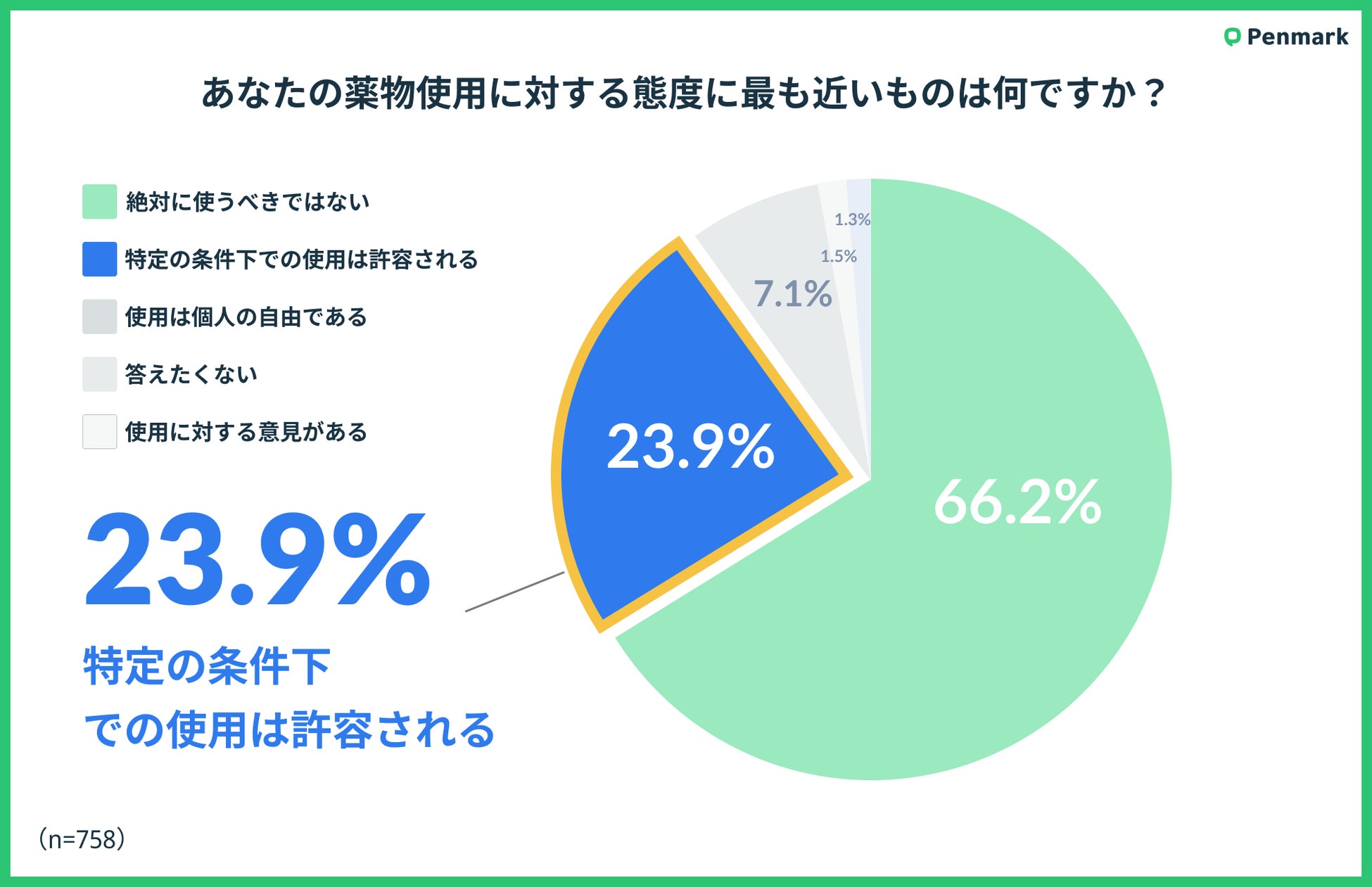 薬物使用に対する態度について聞いたところ、大部分が「絶対に使うべきではない(66.2%)」に続き、「特定の条件下での使用は許容される(23.9%)」、「使用は個人の自由である(7.1%)」と答えた。