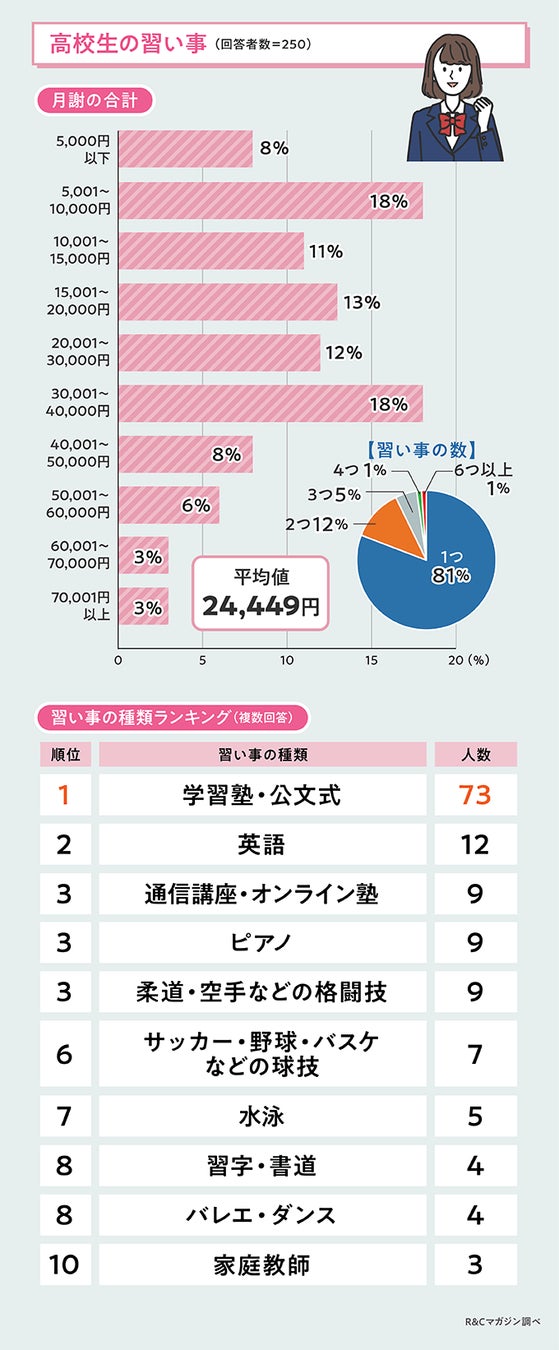 一方で、高校生になると「5,001~10,000円」と「30,001~40,000円」の金額がともに18%という結果になり、習い事の月謝が二極化していることがわかりました。