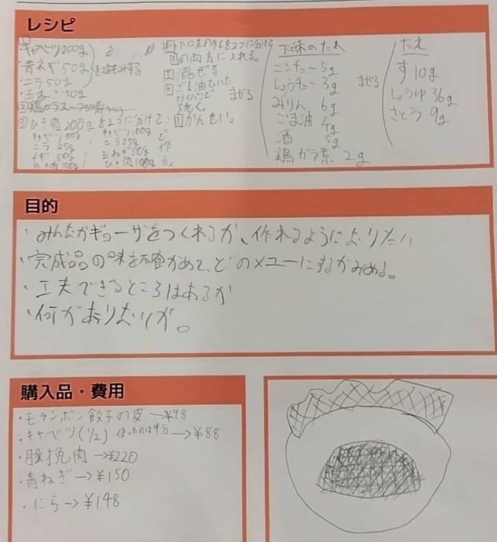 子ども達は、毎週水曜日に会議を重ね、スーパーの餃子から全国各地の有名餃子まで計14種類の餃子を試食し、餃子の皮や餡の材料・味・食感などを細かく分析したうえで、実際に「泉佐野餃子」の試作を始めました。
