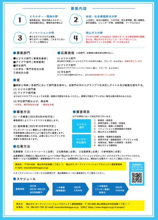 岡山ガス株式会社(岡山市中区桜橋)は、岡山ガス オープンイノベーション プロジェクトとして『ビジネスプランコンテスト2023』を開催。岡山県内の有望な人材とプランの発掘、育成を進めるため、新たな技術やビジネス・アイデアを有する個人、法人を募集し新規事業・協業を創出し、岡山県の産業の発展と地域・社会課題の解決を図り、地域活性に貢献することを目的としています。2回目となるこのプロジェクトでは、県内地域活性や社会・地域課題解決とビジネス実装等を目的に県内の全ての市町村の後援も決定しました。