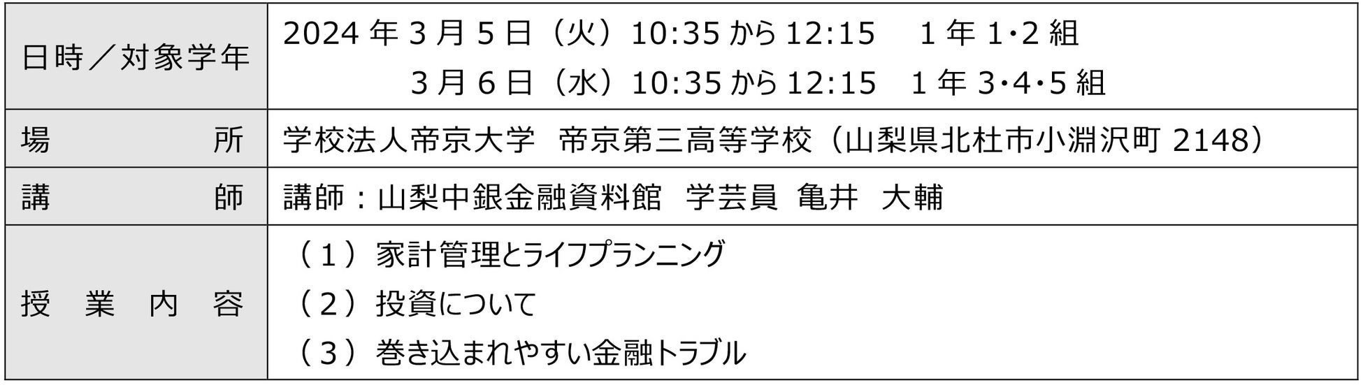 株式会社山梨中央銀行(頭取 古屋 賀章)は、山梨県内の金融リテラシー向上を目的として、2024年3月5日(火)および3月6日(水)に帝京第三高等学校において、マネースクール「社会を生き抜くための第一歩」を実施いたします。