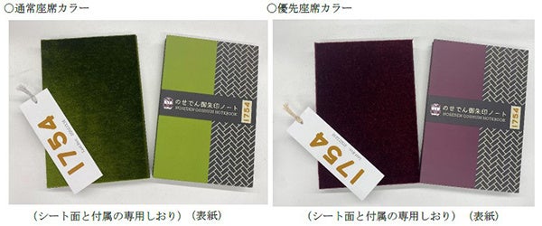 片面に座席シートを貼付した御朱印帳です。通常座席カラーと優先座席カラーからお選びいただけます。御朱印帳だけでなく駅名スタンプなどのコレクションノートとしてもご活用ください。