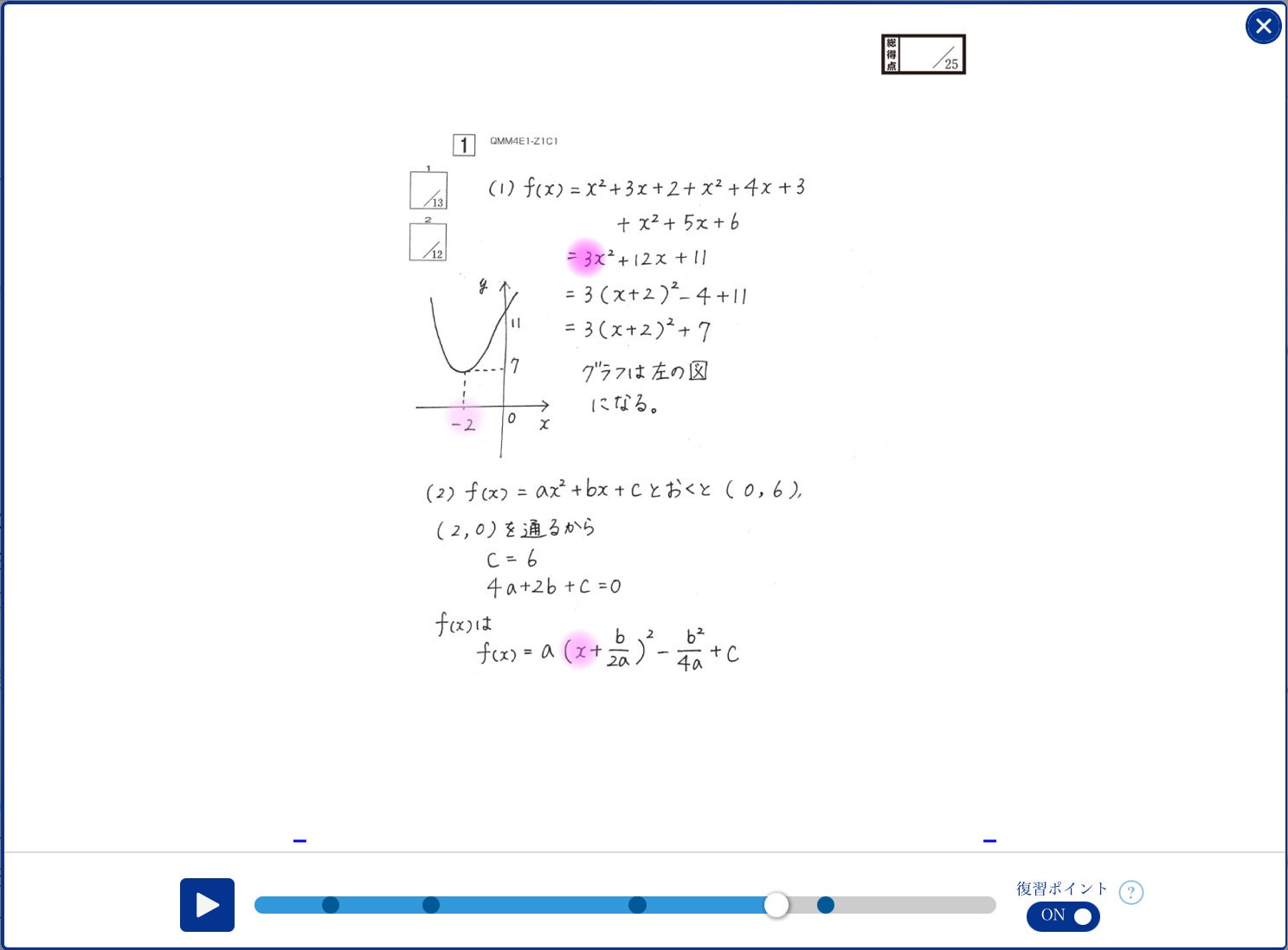 このたび、学習者が作成した答案の筆跡データを取得・解析することで、答案の復習の効果・利便性のさらなる向上を実現します。30秒ほどの筆跡データに圧縮して再生する動画を通して、学習者は自身が作成した答案の作成過程を振り返ることができるようになります。また、筆跡データの解析を通して答案の作成に時間を要した箇所を把握し、復習に活かすことができるようになります。