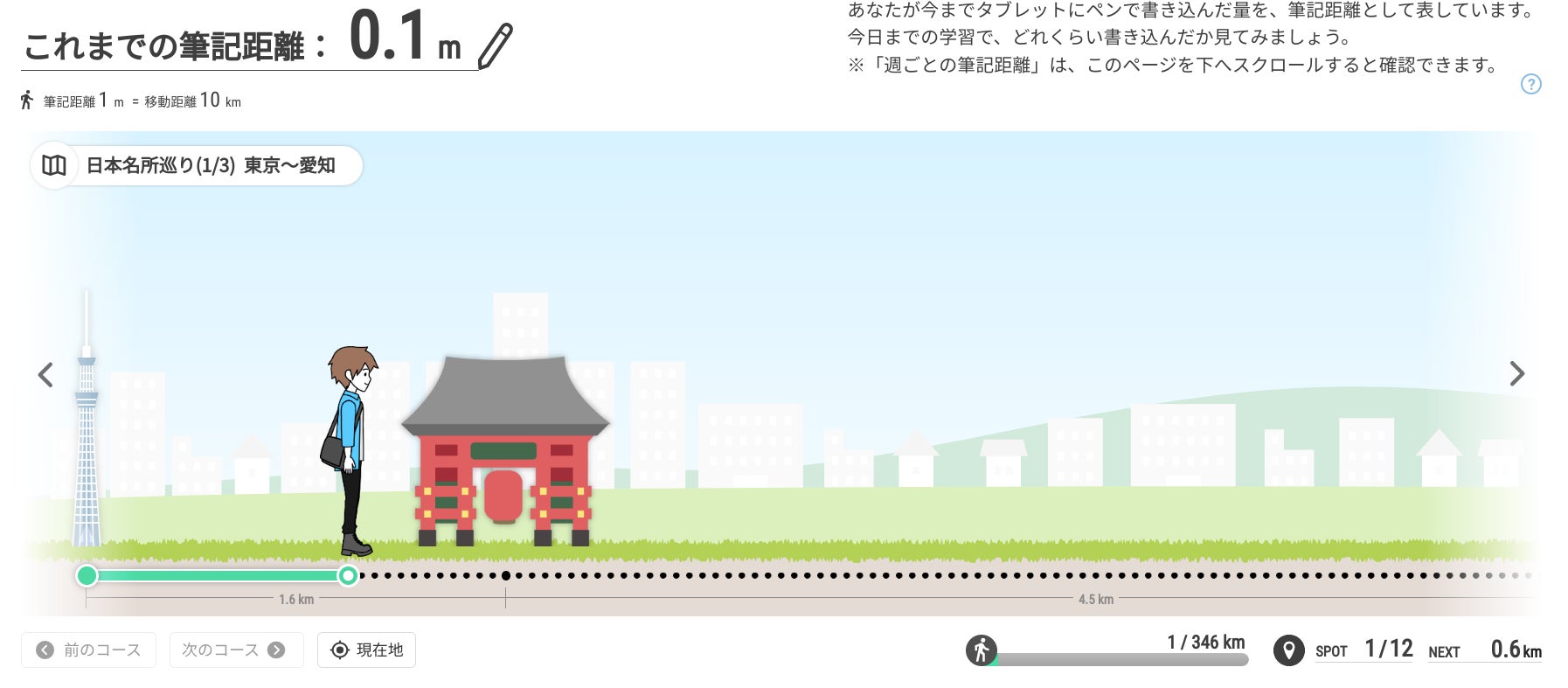 学習者がタブレットに書き込んだデジタルインク量を集計することで、自身がどれだけ「手書き」学習に取り組んだかを、学習者が視覚的に把握できるようになります。また、学習を重ねることで蓄積されたデジタルインク量を移動距離に換算してユーザが日本各地の名所を巡る演出も施されており、学習に継続的に取り組む意欲を引き出します。