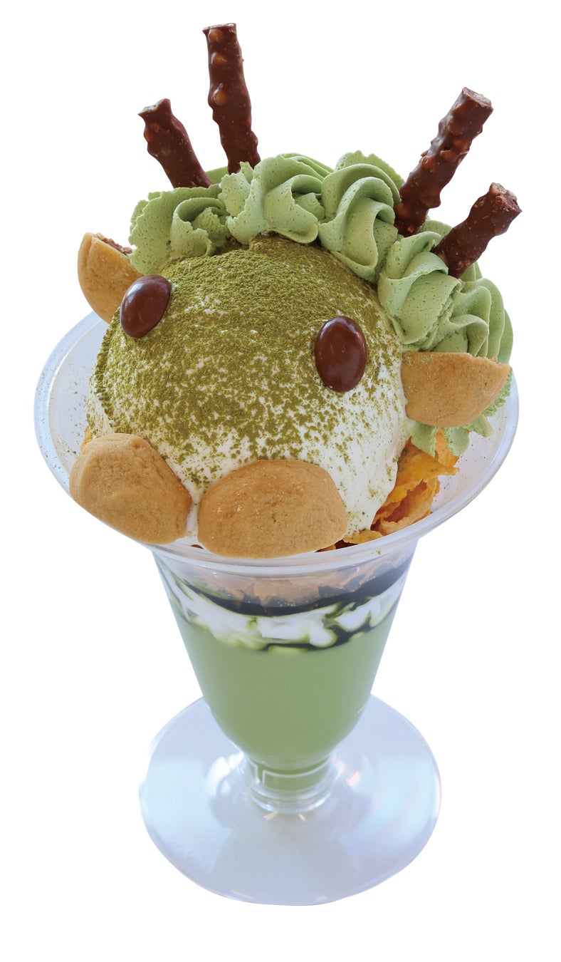マザー牧場のバニラソフトクリームに抹茶パウダーをかけたベースに抹茶ホイップ・チョコレート・クッキーをトッピングして「たつ」の顔を表現しました。パフェの中には、マザー牧場牛乳を使用した「抹茶ババロア」と抹茶ソース・ホイップクリーム・コーンフレークで味はもちろん食感にもこだわった一品です。