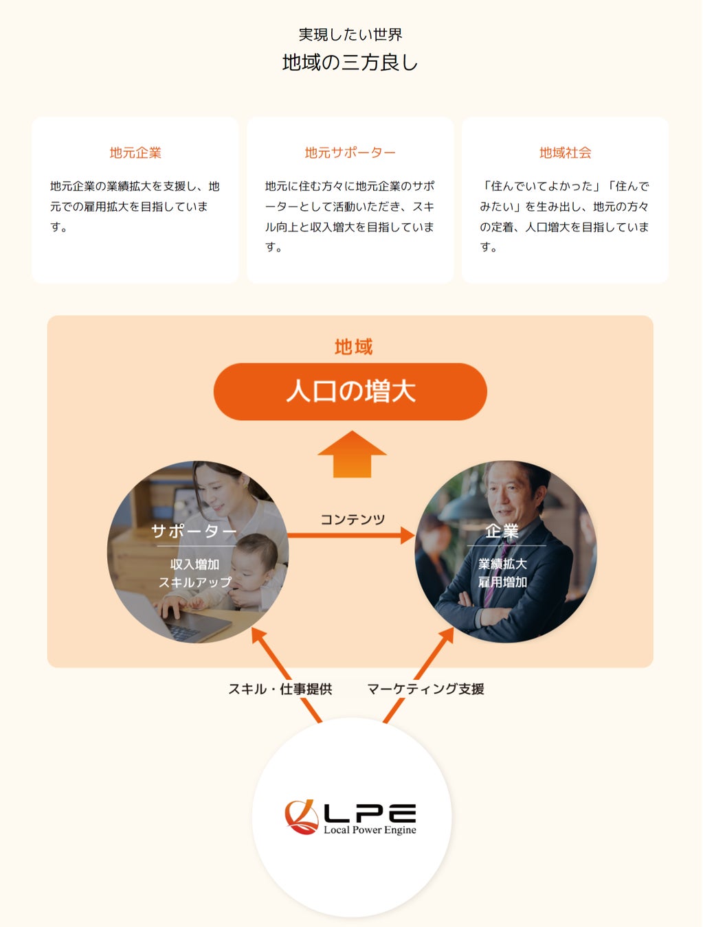 地域企業様にとっては、地元に企業様のファンがたくさん存在し、ポータルサイトや広告に頼ることなく、口コミや直接来店・来場でビジネスが成立することを目指しています。地元サポーターにとっては、家庭の事情で定職に就くことができない地元の方にスキルを提供し、記事作成、インタビューといった仕事を担ってもらい、報酬を受け取ってもらうことを目指しています。地域に住んでいる方々にとっては、地元の魅力を再発見し、「この地域に住んでいてよかった」と感じてもらうことを目指しています。そして地域経済にとっては、地域企業の成長を支援し、地域経済が循環していくことを目指しています。結果的に、地域に仕事と人口が増え、地域が活性化することに貢献いたします。