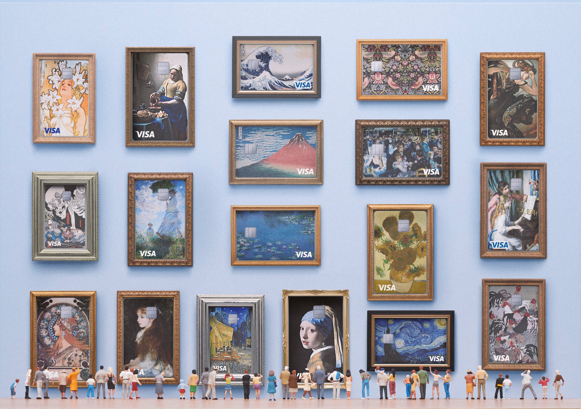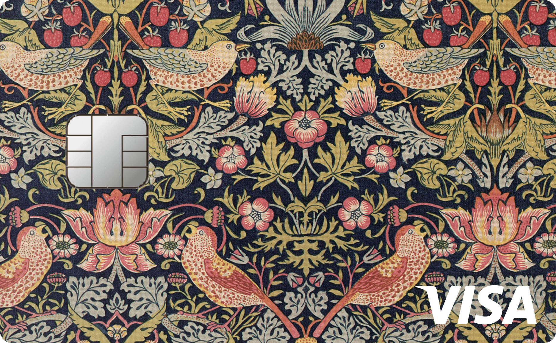 18作品の名画をクレジットカードにしたコレクションは日本初(※1)で、オリジナルの名画の色彩や質感を忠実に再現しています。モネの「睡蓮」、ゴッホの「ひまわり」、フェルメールの「真珠の耳飾りの少女」、ミュシャの「4つの花(ユリ)」、ルノワールの「ピアノを弾く少女たち」、ウィリアムモリスの「ストロベリー・シーフ」、葛飾北斎の「富嶽三十六景」、歌川国芳の「相馬の古内裏」、伊藤若冲の「群鶏図」など、世界の名画をデザインしたカードをお好みで選べます。