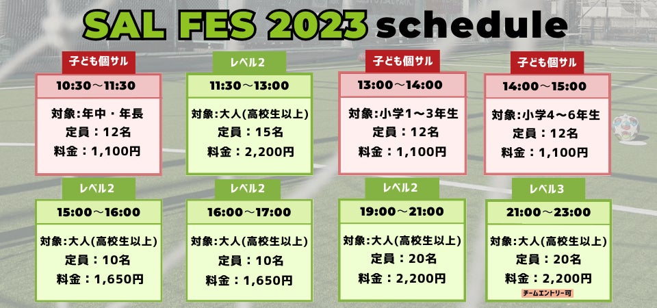 東急Sレイエス フットボールスクール池袋が活動するアディダスフットサルパーク池袋では、1日中様々な年代が個サルを楽しめるよう『SAL FES 2023』を実施します。