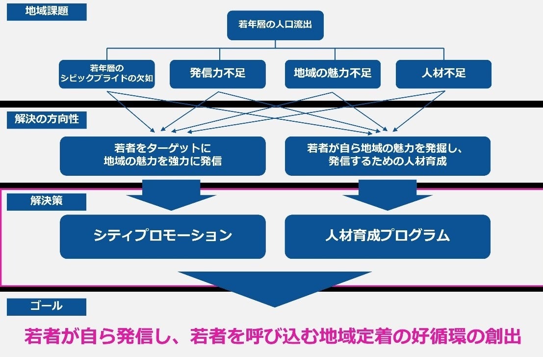 このような地域の若年層の流出という課題背景に対し、若者をターゲットに地域の魅力を強力に発信するシティプロモーションを実施するとともに、若者自らが地域の魅力を発掘し、発信するための人材育成プログラムを中長期で実施する予定です。また、魅力発信や発掘のみを目的とするものではなく、地域産業の活性化、新規事業の創出等までを見据え本プロジェクトを発展させることにより、地域経済への寄与、ひいては若者を呼び込む地域定着の好循環を創出することを目指します。