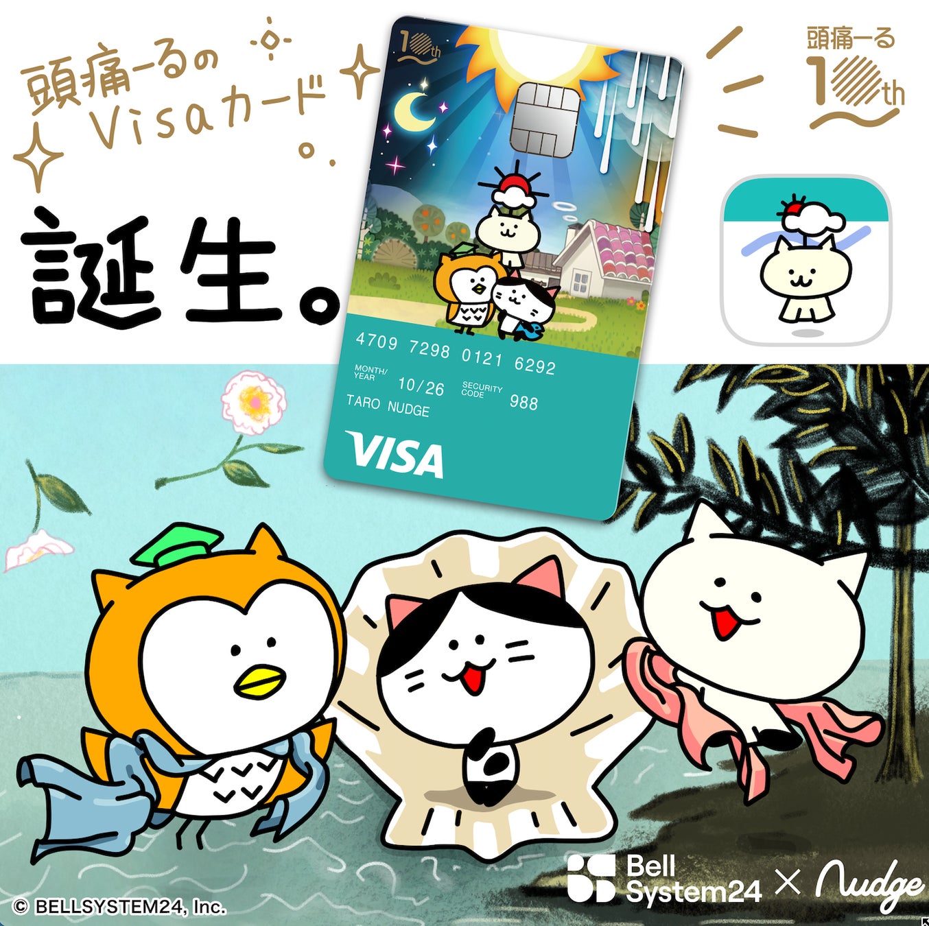 また、「頭痛―る」のサービス開始10周年を記念して、SNSでも人気の「頭痛―る」のキャラクター「ふくろう博士」「マロ」「てるてるネコ」のイラストを使用したオリジナルデザインの公式クレジットカードを発行いたします。期間限定で、発行手数料が無料となる特別キャンペーンも開催しますので、ぜひご利用ください。