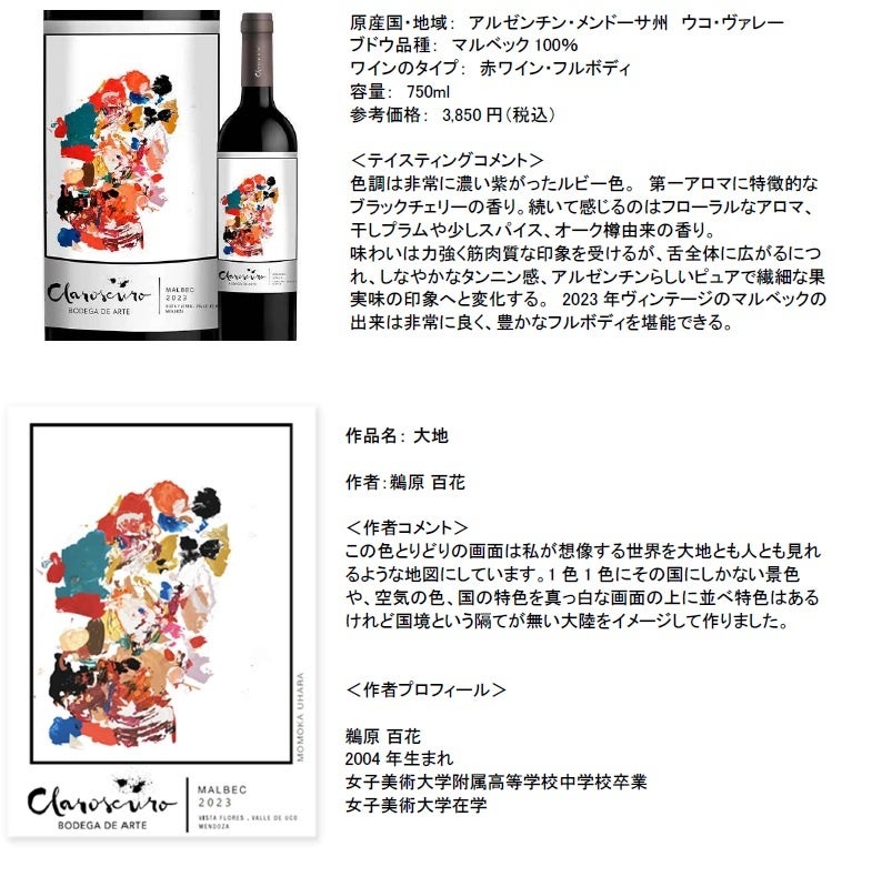 コンテストで最優秀賞を受賞した、鵜原 百花 さんの作品、『大地』がラベルに描かれたこの記念ワインに用いられたのは、世界を代表する「アートワイナリー」である『クラロスクーロ ボデガ・デ・アルテ』を代表する『クラロスクーロ・マルベック』の2023年ヴィンテージ。 2023年は、日本・アルゼンチンの外交樹立125周年という記念すべき年であり、そして2023年ヴィンテージは天候も良く、ブドウの出来が非常に良い年であった。