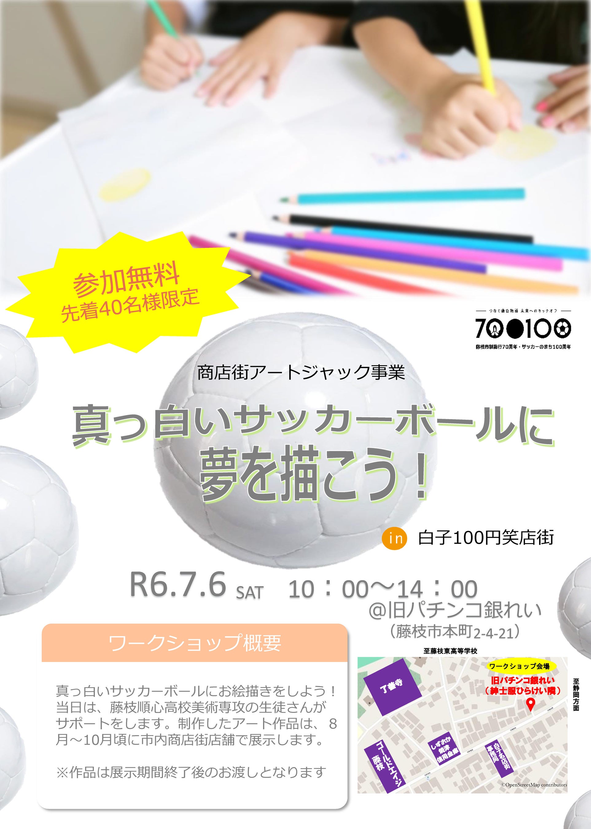 第2弾として、白子商店街の定期イベント「白子100円笑店街」で真っ白なサッカーボールにオリジナルのアートを描く市民向けワークショップを開催します。