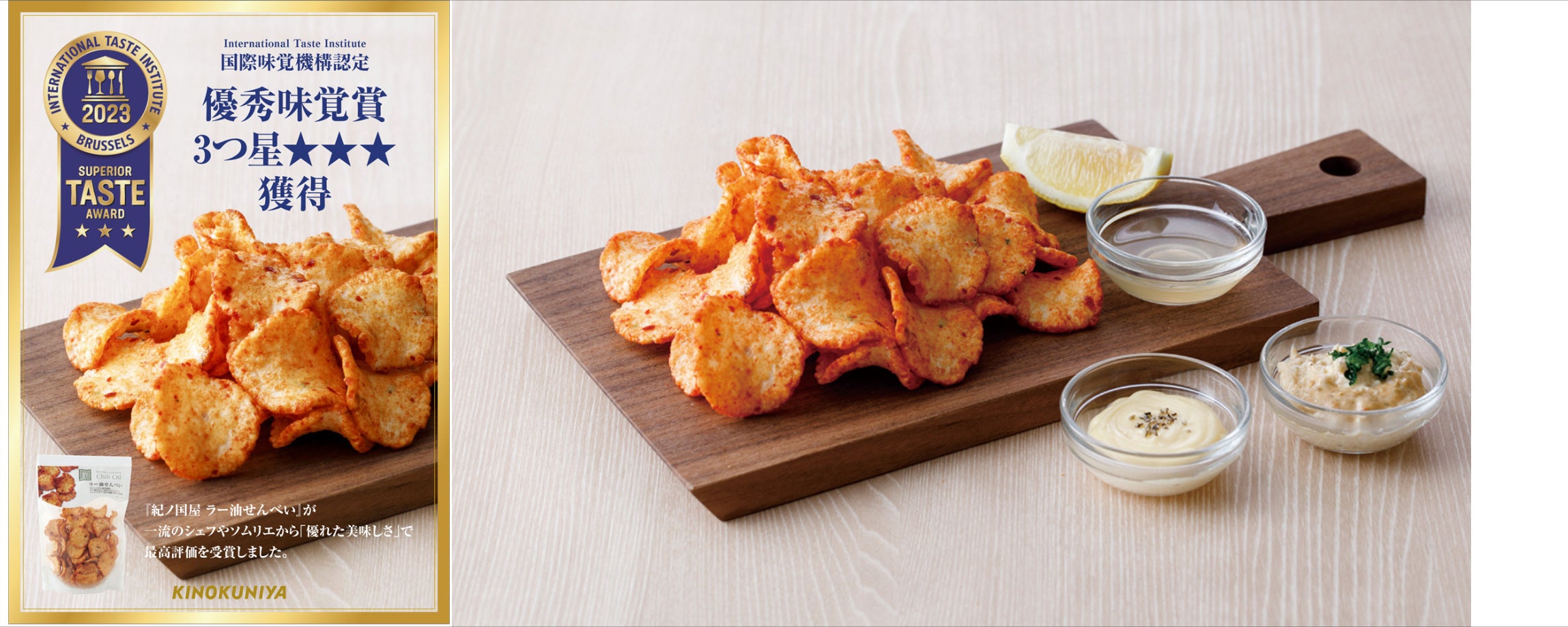 2023年 国際味覚機構認定の品評会で「優秀味覚賞3つ星★★★」を獲得した大人気のスナック菓子「ラー油せんべい」も販売!