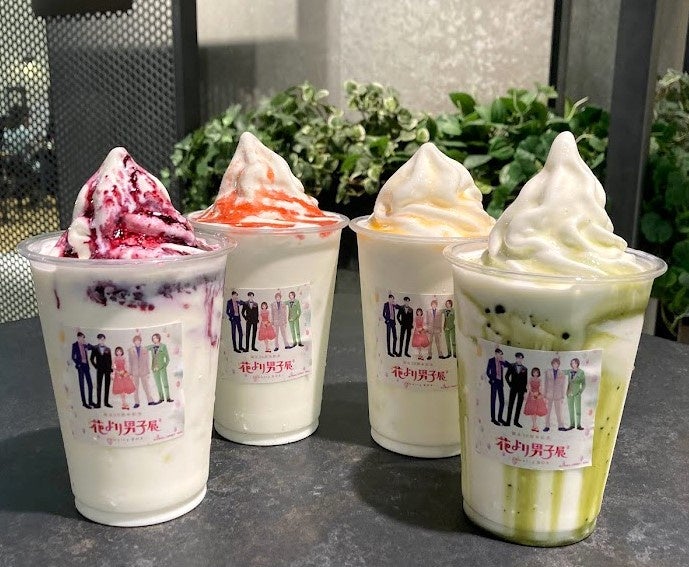 期間中各階カフェ・レストランでは、阪神梅田本店限定メニューが登場!展示会のキービジュアルでF4が胸に挿しているお花の色をテーマに、今だけしか味わえないひんやりスイーツや、団子(だんご)を使ったスイーツなど、盛りだくさんご用意しました。さらに『花より男子』コラボスイーツを食べて、イラスト入りコースターがもらえるチャンスも。