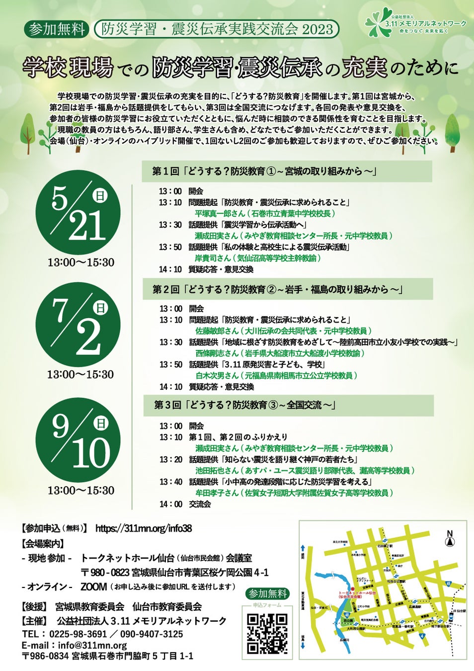 5月21日、防災学習・震災伝承実践交流会2023第1回「どうする?防災教育①」を会場(仙台)とオンラインで開催します。