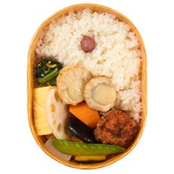 青森県の郷土料理のイカメンチ、青森県産ほたてが入った和風弁当です。