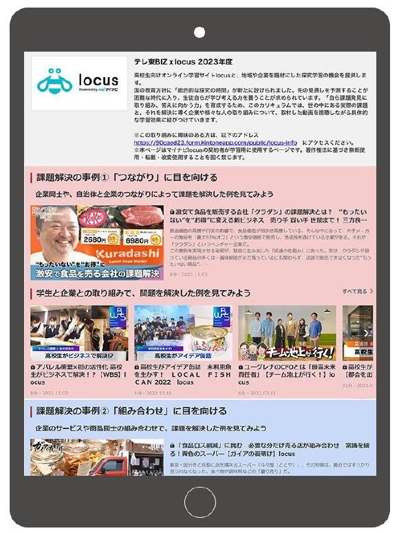 地域や企業を題材に学習機会を提供してきた『locus』と、経済報道に定評のあるテレビ東京報道局の取材に基づくコンテンツを配信する『テレ東BIZ』が、2022年2月から実施した高等学校を対象の実証実験を経て、探究学習のための“紙と配信のハイブリッド教材”を開発。記述と動画視聴を軸に生徒一人一人の「問い」を重視するステップを踏むことで、探究学習により一層の深みを提供します。