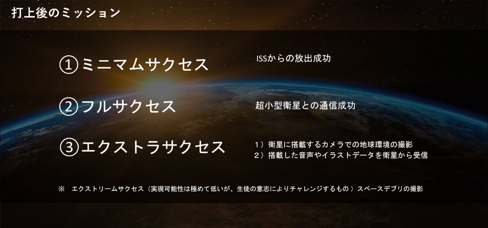衛星は今後宇宙空間で生徒によって考案されたミッション達成を目指していきます。生徒同士の協議により衛星のミッションは4段階に設定されています。