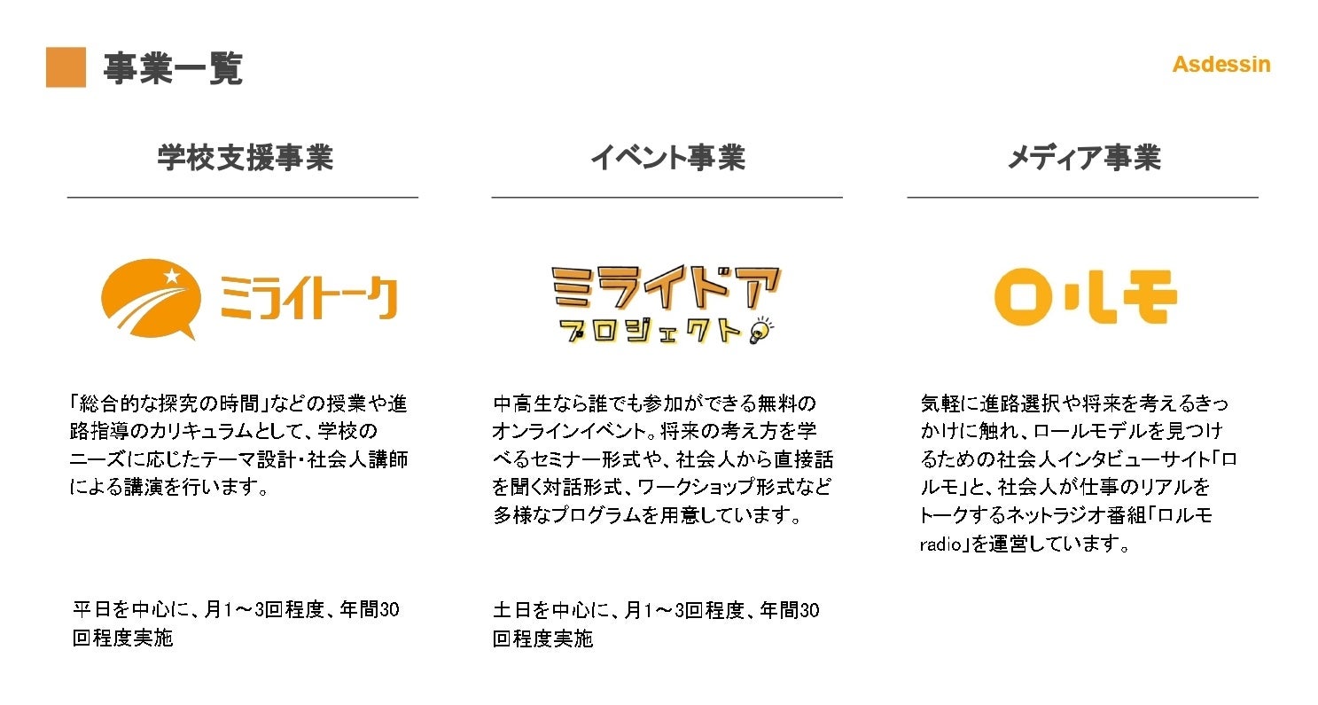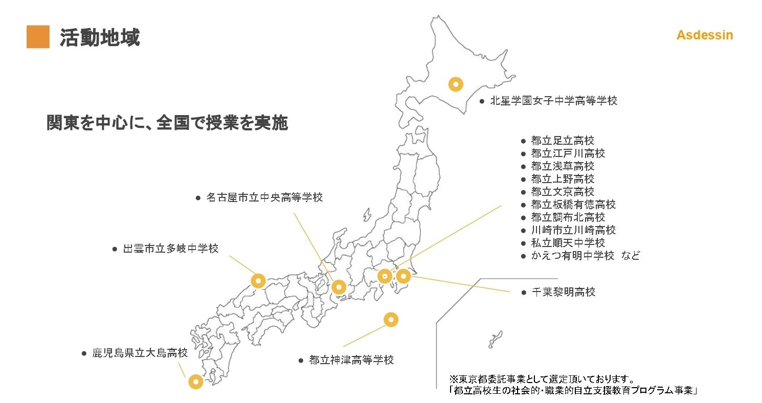 NPO法人アスデッサンは、2011年の設立以来、延べ15,000名の中高生にキャリア支援のプログラムを提供してきました。学校支援事業である「ミライトーク」では、進路指導や総合学習(探究学習)の授業コンテンツとしてプログラムを提供し、社会人を講師として派遣する講演・ワークショップを実施しています。この活動は、東京都の委託事業「都立高校生の社会的・職業的自立支援教育プログラム事業」に認定されています。