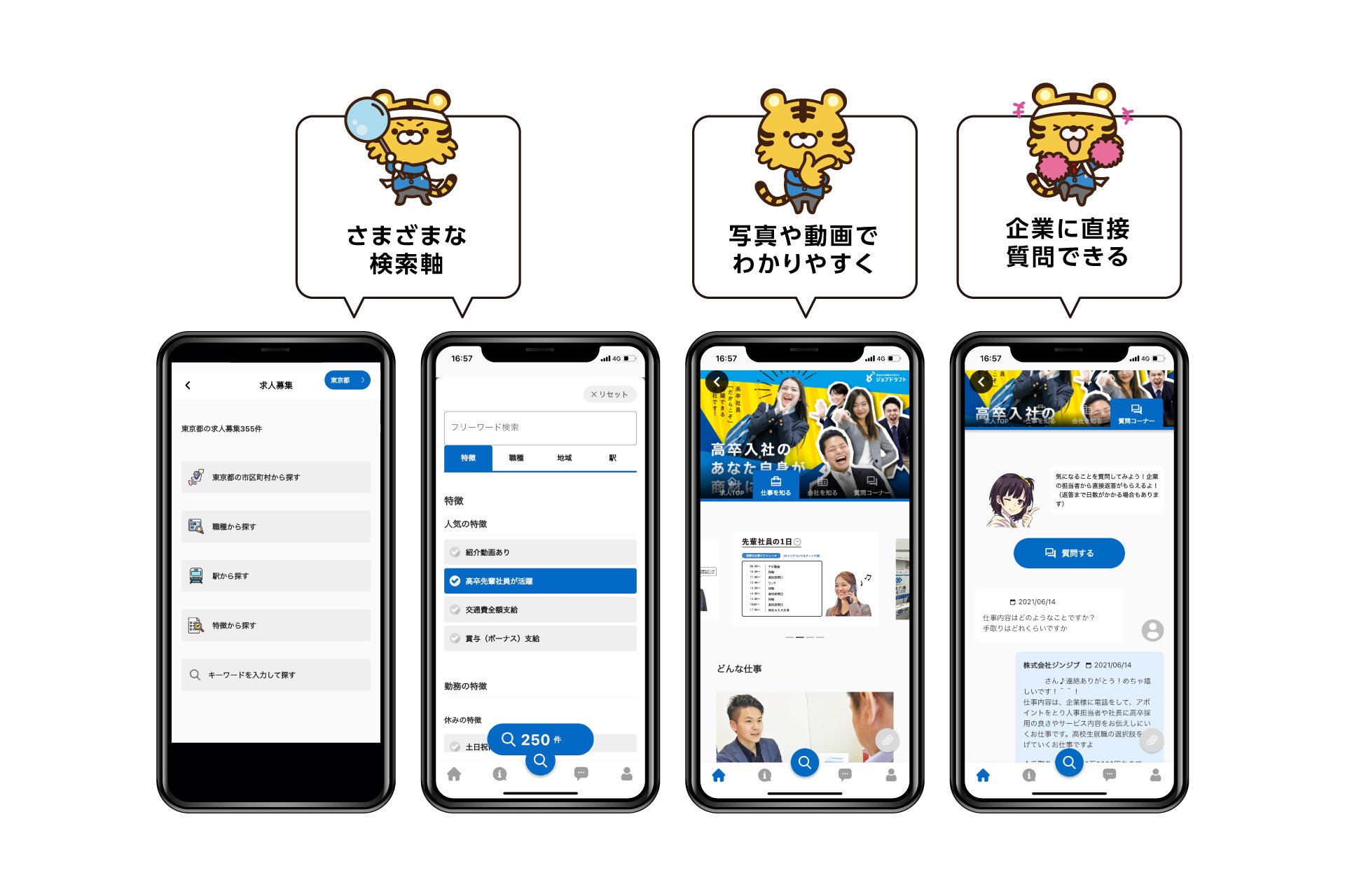 高卒採用に文字情報のみを用いていた企業の「求人票」の情報を、Webサイトやアプリに掲載した高校生のための求人情報メディアです。高校生は学校の進路指導室以外でも、スマホなどからいつでも情報にアクセスできます。