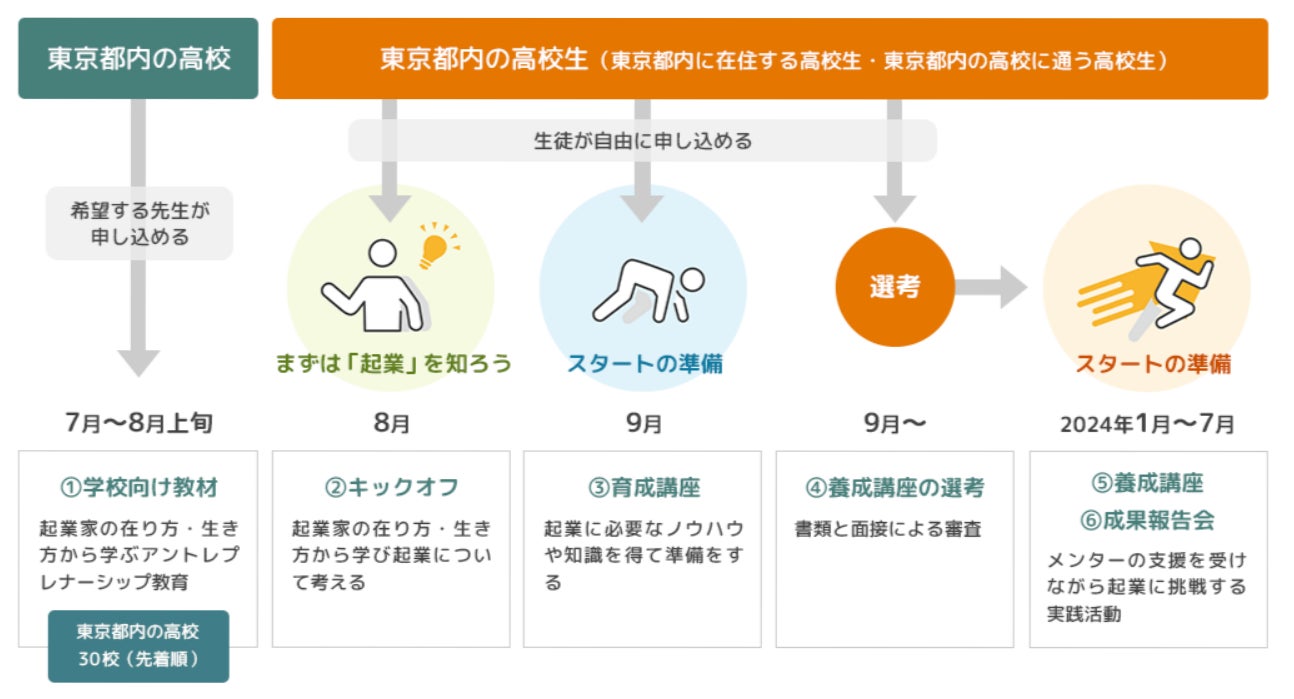 東京都が起業家の裾野をこれまで以上に拡げていくために推進している高校生を対象とした養成プログラム。将来的に起業を目指す高校生などを発掘するとともに、起業の意向を持つ高校生など向けに知識やスキルの習得、起業家精神の醸成に寄与するプログラムを提供します。