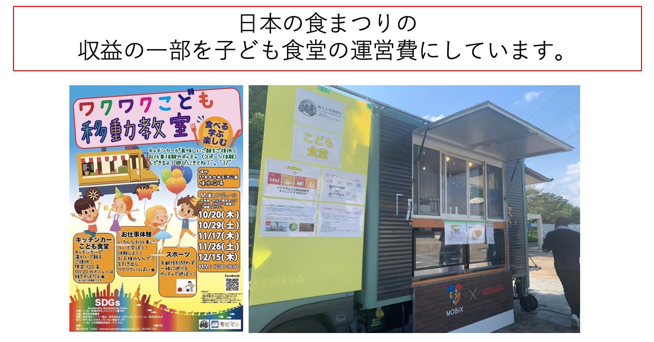 さらにはキッチンカーだけでなく、MOBIX(Mobility Box=移動する箱)と称した様々な移動販売車を展開することで、 「店に行く」から「店が来る」文化創造を行い、移動できるからこそのメリットを生かして、住宅団地や公園、