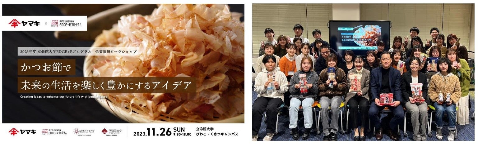 そういった中で、イノベーション創出を担い得る次世代のアントレプレナーシップ養成を目的とした立命館大学の実践型プログラム「EDGE+Rプログラム」において、ヤマキ・立命館大学・武庫川女子大学本田研究室・早稲田大学野中研究室が共同で「かつお節SDGsワークショップ」を実施するに至りました。