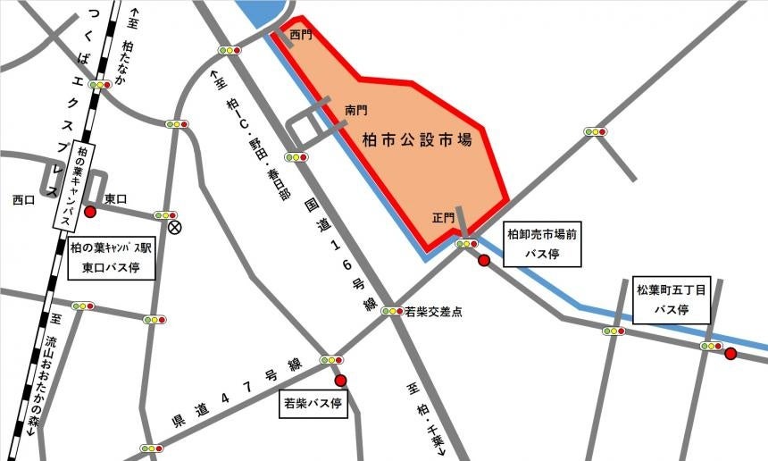 西口4番乗り場から柏05「若柴循環」または柏09「柏の葉キャンパス行」乗車。バス停「若柴」下車。一つ目の信号(「若柴循環」はバス進行方向反対側に直進、「柏の葉キャンパス行」はバス進行方向に直進)を右折。国道16号線を超え(若柴交差点)、一つ目の信号を左折してすぐ(市場正門まで、徒歩約6分)